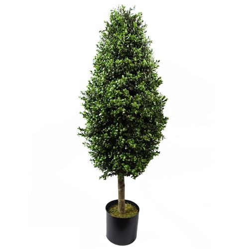 A highly realistic replica of buxus boxwood tree in a large 120cm size This tree is UV resistant and designed to be used outdoors As we have it arranged in our photos this measures 120cm high x 45cm x 45cm The branches are wired and can be shaped to fir your space The trunk is natural wood. Potted in a plain plastic pot and is ready to display. You can make these trees look all the more impressive by popping inside a larger planter and covering with soil- bark or gravel to add to the realistic effect