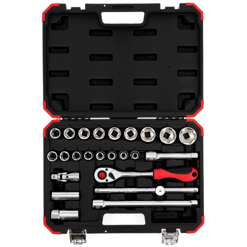 Il set di chiavi a bussola R69003024 nel design rosso GEDORE contiene 24 utensili protetti da morsetto, tra cui un cricchetto di cambio leva con protezione a sfera, inserti per chiavi a bussola, due chiavi a candela con gomma di fissaggio pressata, varie estensioni e adattatori. È adatto per custodie a vite azionate manualmente. Gli utensili sono realizzati in acciaio cromato-vanadio e cromato satinato opaco. Il cricchetto del cambio 2K offre una rotazione destra/sinistra (commutabile tramite leva) e un pulsante di rilascio. È finemente dentato con 72 denti, ha un angolo di ritorno di 5°, una testa ovale e un manico a 2 componenti.