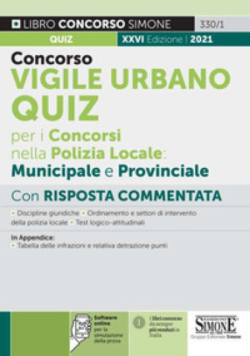 Il libro Concorsi Vigile urbano - Quiz per i concorsi nella Polizia locale: municipale e provinciale, edizione 2023, raccoglie oltre 1200 quesiti a risposta multipla con soluzione commentata per prepararsi al meglio in vista delle prove scritte. (vedi tutte le news sui concorso per vigili urbani) Nella Parte I, oggetto delle domande sono le materie giuridiche fondamentali generalmente richieste nei bandi di concorso (diritto costituzionale, diritto amministrativo, diritto penale, diritto processuale penale, legislazione di pubblica sicurezza, diritto regionale, ordinamento degli enti locali, pubblico impiego locale e sistema sanzionatorio amministrativo), nonché le discipline specifiche attinenti la formazione del «Vigile urbano», ovvero: la legge quadro 65/1986 sull'ordinamento della Polizia municipale, i settori di intervento della Polizia locale (polizia urbana e rurale, polizia sanitaria, veterinaria e mortuaria, polizia commerciale e metrica, polizia demaniale, edilizia ed ambientale, polizia stradale) e la normativa in tema di salute e sicurezza nei luoghi di lavoro. Tutti gli argomenti trattati sono aggiornati alle ultime novità normative, in questa edizione si segnalano, in particolare: il D.Lgs. 150/2022, noto come Riforma Cartabia del processo penale, e il D.Lgs. 36/2023, Nuovo Codice dei contratti pubblici. Nella Parte II, invece, sono proposti test logico-attitudinali, spesso richiesti nelle prove preselettive. Conclude il testo Concorsi Vigile urbano Quiz un'appendice contenente la tabella riepilogativa delle infrazioni al Codice della strada comportanti la decurtazione dei punti dalla patente di guida. Utilizzando il QR code (rinvenibile nell'ultima pagina) è possibile accedere al software dove sono disponibili centinaia di quiz per esercitarsi e valutare il livello di preparazione raggiunto.