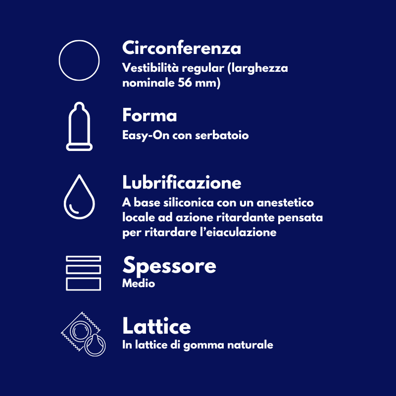 Durex Lunga Durata è indicato per prolungare il piacere sessuale attraverso il lubrificante Performa che ritarda l'eiaculazione.