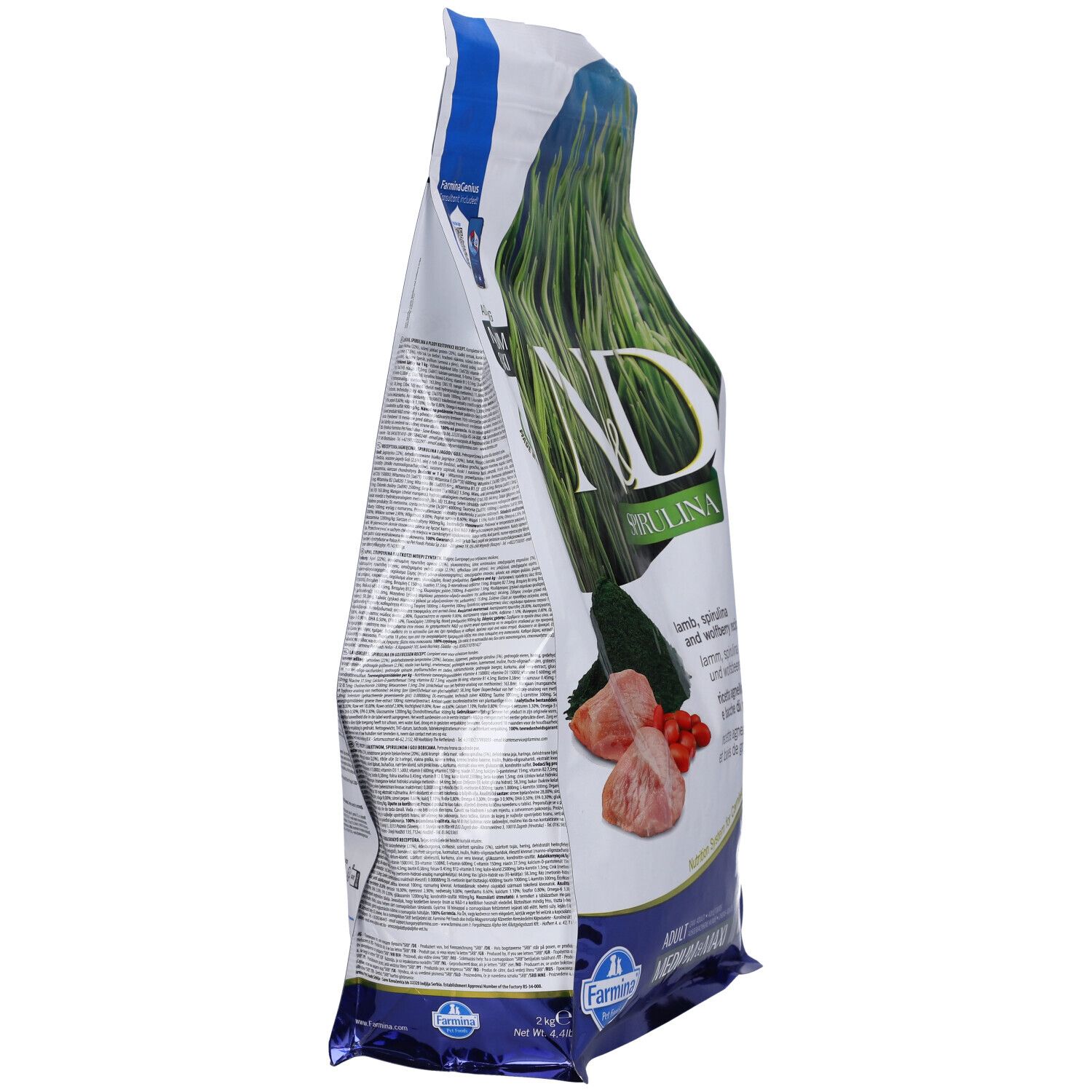Farmina N&D Spirulina Lamb Adult Medium Maxi Ricetta agnello, spirulina e bacche di Goji. Alimento completo per cani adulti. Modo d'uso: Peso del cane in kg 10 15 20 25 30 35 40 50 60 70 Dose giornaliera raccomandata in g 90-160 120-220 150-270 180-320 205-365 230-410 255-450 300-530 350-610 390-685 Ingredienti: Agnello (22%), proteine di agnello disidratate (20%), patata dolce, grasso di pollo, spirulina disidratata (5%), uova essiccate, aringa, proteina di aringa disidratata, bacche di Goji essiccate (2.5%), olio di pesce (da aringa), fibra di piselli, carote essiccate, farina di erba medica, inulina, fruttoligosaccaridi, estratto di lievito (fonte di manno-oligo-saccaridi), spinaci essiccati, bucce e semi di psillio, cloruro di sodio, lievito di birra essiccato, curcuma, estratto di Aloe vera, glucosamina, solfato di condroitina. Additivi per kg: Vitamina A 15000Ui; Vitamina D3 1500Ui; Vitamina E 600mg; Vitamina C 150mg; Niacina 37.5mg; Calcio D-pantotenato 15mg; Vitamina B2 7.5mg; Vitamina B6 6mg; Vitamina B1 4.5mg; Biotina 0.38mg; Acido folico 0.45mg; Vitamina B12 0.1mg; Cloruro di colina 2500mg; Beta-carotene 1.5mg; Zinco (chelato di zinco dell'analogo idrossilato della metionina): 163.8mg; Manganese (chelato di manganese dell'analogo idrossilato della metionina): 64.6mg; Ferro [chelato di ferro (Ii) di idrato di glicina]: 58.3mg; Rame (chelato di rame dell'analogo idrossilato della metionina): 15.8mg; Selenio (lievito al selenio inattivato): 0.00088mg; DL-metionina, tecnicamente pura 4000mg; Taurina 1000mg; L-carnitina 300mg. Additivi organolettici: estratto di tè verde 100mg; estratto di rosmarino. Antiossidanti: estratti di tocoferolo da oli vegetali. Componenti Analitici: proteina grezza 28.00%; grassi grezzi 18.00%; fibre grezze 2.90%; umidità 9.00%; ceneri grezze 8.60%; Calcio 1.10%; Fosforo 0.80%; Omega-6 3.30%; Omega-3 0.90%; DHA 0.50%; EPA 0.30%; Glucosamina 1200mg/kg; Condroitina solfato 900mg/kg.