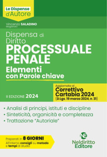 Per numerosi esami e concorsi (o per acquisire una conoscenza di base delle materie) è sempre più avvertita l'esigenza di strumenti snelli di preparazione, le famose Dispense, assai più sintetiche dei Manuali e degli stessi Compendi. La sinteticità , tuttavia, non deve mai pregiudicare organicità e completezza della trattazione, imponendo quindi una più elevata precisione descrittiva di principi, istituti e discipline. Queste le ragioni sottese alla messa a punto della Collana "Le Dispense d'Autore. Elementi con Parole chiave", nata sulla convinzione della necessità di una ancor più spiccata competenza autorale nel predisporre volumi snelli, ma chiari e impeccabili nell'illustrare in modo sintetico discipline complesse e vaste. Ad arricchire le Le Dispense d'Autore, sono inserite, in chiusura dei Volumi, le parole chiave, che indicano istituti o principi non trascurabili nella preparazione, con la essenziale definizione. Un vero e proprio concentrato di principi, istituti e elementi da cui non si può prescindere nel mettere a punto la preparazione. Nella seconda edizione della Dispensa di Diritto Processuale Penale si è tenuto conto delle più importanti novità legislative intervenute, tra cui si segnalano: Decreto Correttivo Cartabia del 2024; D.L. 02 marzo 2024, n. 19 - (Trasferimento fraudolento di valori); L. 27 dicembre 2023, n. 206 - (Made in Italy); L. 24 novembre 2023, n. 168 - (c.d. Femminicidio); L. 13 novembre 2023, n. 159, di conv. con modif. del D.L. 15 settembre 2023, n. 123 - (c.d. Decreto Caivano); L. 9 ottobre 2023, n. 137, di conv. con modif. del D.L. 10 agosto 2023, n. 105 - (Intercettazioni).