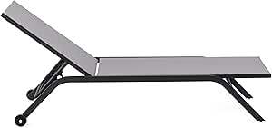 Lettino con struttura nera in acciaio verniciata a polvere, seduta e schienale in textilene 2x1 con 6 diverse inclinazioni possibili di colore grigio. Dotato di due ruote nere diam. 8 cm. Portata max. 130 kg. Prodotto da assemblare