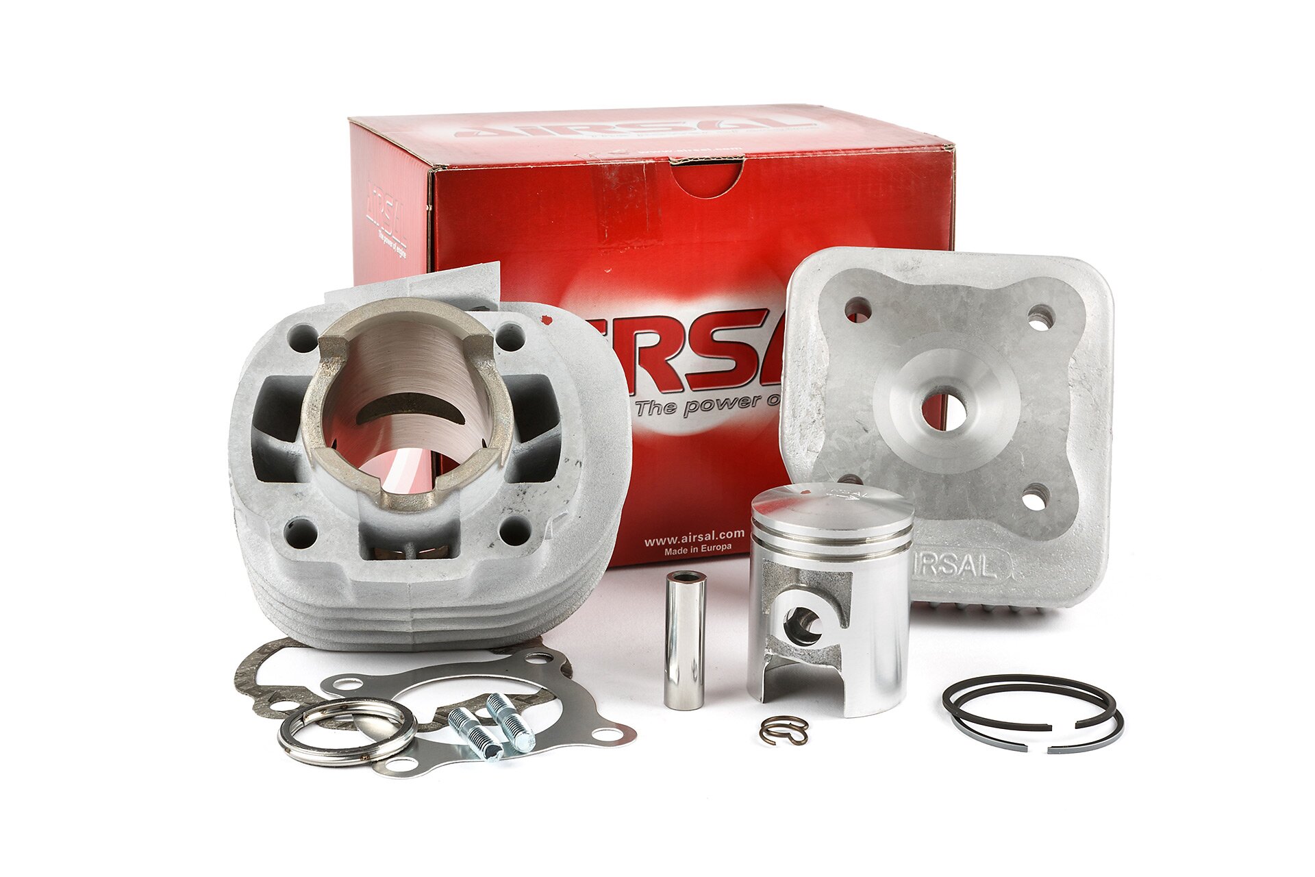 Cilindro Minarelli Airsal Sport 50cc Cilindro 50cc in alluminio del produttore spagnolo Airsal, ad un prezzo molto conveniente. Design del cilindro Airsal Sport per Minarelli 50 AC L'alesaggio rivestito in Nikasil, le doppie fasce elastiche e lo scarico trapezoidale assicurano una coppia potente ai medi regimi. In combinazione con un carburatore di almeno 17,5 mm e uno scarico sportivo o da corsa, si può facilmente raggiungere una potenza di circa 8-10 CV. In breve, molta potenza per pochi soldi. il kit 70 alu aerox comprende: Cilindro in alluminio da 50cc, 6 travasi e scarico ovale Pistone a 2 segmenti con spinotto da 10 mm Testata ad alta compressione Set di guarnizioni