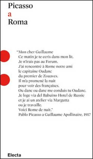 Valentina Moncada che gestisce l'omonima galleria d'arte a Via Margutta ha scoperto per caso che nel 1917 il marchese Giuseppe Patrizi, suo bisnonno, affittò a Picasso uno studio nell'antico complesso degli Studi Patrizi. Il libro racconta l'attività creativa dell'artista durante il suo primo soggiorno romano, attraverso l'esposizione di alcune fotografie di Picasso nel suo atelier di Via Margutta e alla corrispondenza tenuta in quel tempo da Picasso e dai suoi compagni d'avventura (soprattutto Jean Cocteau), consentendo di ripercorrere la quotidianità di quei mesi romani, in particolare la creazione di due grandi capolavori, "L'Italiana" e "L'Arlecchino e donna con collana". Seguono una serie di documenti, che illustrano i rapporti di Picasso con gli artisti coinvolti a Roma nella genesi della "Parade", balletto per il quale l'artista realizzò costumi e scenografie. La pubblicazione analizza inoltre le possibili motivazioni della scelta del maestro di lavorare proprio a Via Margutta a un passo dal Circolo Artistico romano degli Studi Patrizi e il suo rapporto con i Futuristi.