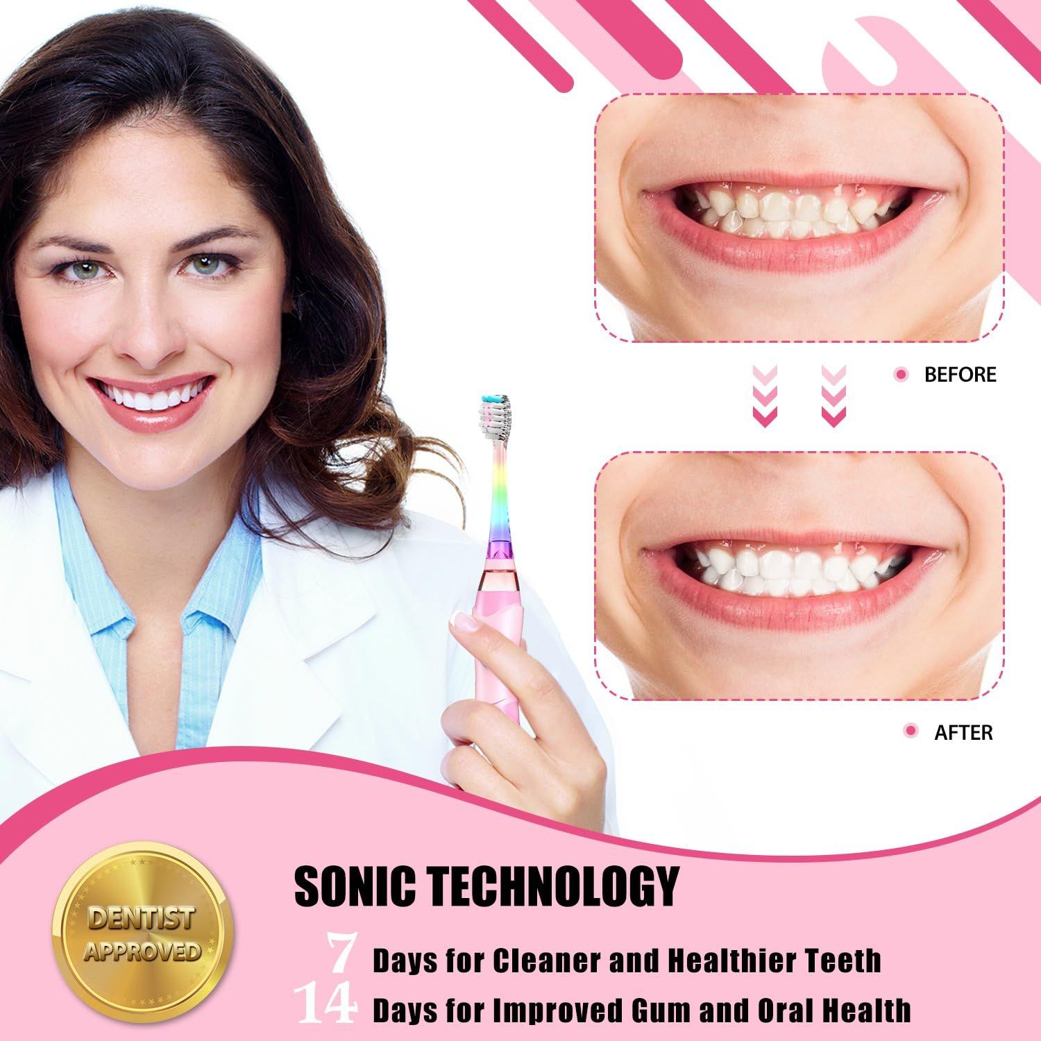 Ultima versione aggiornata: tecnologia sonica appositamente studiata per i bambini; il timer intelligente insegna ai bambini a lavarsi i denti proprio come un dentista; la luce LED morbida e colorata rende divertente lo spazzolamento; le setole in nylon morbido e le testine per uso alimentare sono selezionate secondo criteri rigorosi. Appositamente progettato per i bambini: La tecnologia sonica è stata sviluppata in base alle caratteristiche orali e dentali dei bambini. 7 giorni per denti più puliti e sani e 14 giorni per una migliore salute dentale e orale. Le giuste abitudini di spazzolamento: timer intelligente di 2 minuti con promemoria di pausa ogni 30 secondi per incoraggiare l'abitudine di spazzolamento raccomandata dal dentista. Spazzolino divertente: il simpatico manico dello spazzolino e la luce LED colorata sono perfettamente progettati per rendere lo spazzolamento facile e divertente per i bambini dai 2 anni in su. Le setole morbide e la testina in silicone di alta qualità garantiscono una migliore esperienza di spazzolamento. Pulizia efficiente: Questi spazzolini elettrici hanno migliorato l'efficacia della rimozione delle macchie nelle aree difficili da raggiungere del 75% rispetto agli spazzolini manuali.Include 3 testine morbide.SENZA Bpa.