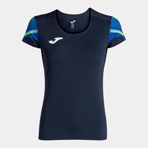RENDIMENTO: Maglietta tecnica a manica corta per donna, ideale per il running e le attività sportive, progettata per mantenere il tuo ritmo e le tue prestazioni in ogni gara. COMODITÀ: Collo rotondo e finiture a taglio laser che prevengono le irritazioni, garantendo un'esperienza comoda e leggera durante gli allenamenti intensi. VENTILAZIONE: Perforazioni strategicamente posizionate sulla schiena ottimizzano la ventilazione, aiutando a regolare il sudore e mantenendo la pelle fresca e asciutta. DURABILITÀ: Tessuto elastico, leggero e traspirante (90% poliestere, 10% spandex) che assicura un'asciugatura rapida e una totale libertà di movimento. STILE: Design moderno con sublimazione sulle maniche e logo Joma in printing, combinando funzionalità e un'estetica professionale per le corridrici esigenti.