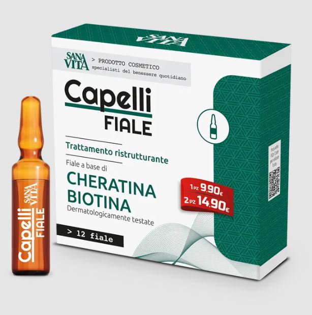 Sanavita Capelli 12 fialeIntegratore Benessere CapelliA cosa serve Sanavita Capelli FialeSanavita Capelli Fiale è un integratore alimentare a base di Cheratina e Biotina utile anche in caso di caduta. Dermatologicamente testato. Senza glutineSi può usare i