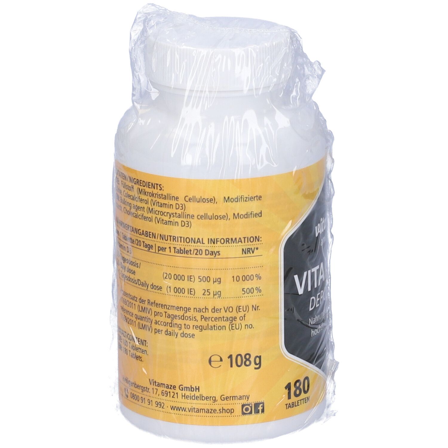 Gli integratori non sostituiscono un’alimentazione equilibrata e variegata e uno stile di vita sano. Integratore alimentare . Ingredienti: Agenti di carica (cellulosa microcristallina), amidi modificati, colecalciferolo (vitamina D3). Per 1 Tablet/ 20 Giorni NRV * Vitamin D3: 20-Giorni dose (20000 IU) 500 mcg (1000 IU) 25 mcg 10000 % 500 % Assunzione consigliata: Prendere 1 compressa ogni 20 giorni Avvertenze: Non superare la dose giornaliera espressamente raccomandata. Tenere fuori dalla portata dei bambini al di sotto dei tre anni. Non adatto ai bambini ed agli adolescenti. Conservazione: Conservare il prodotto in confezione integra, in luogo fresco e asciutto. Si prega di fare riferimento, se necessario, ad ulteriori istruzioni riportate sulla confezione. Contenuto netto: 180 compresse = 108 g Produttore: Vitamaze GmbH Weberstrasse, 6 Heidelberg Germania