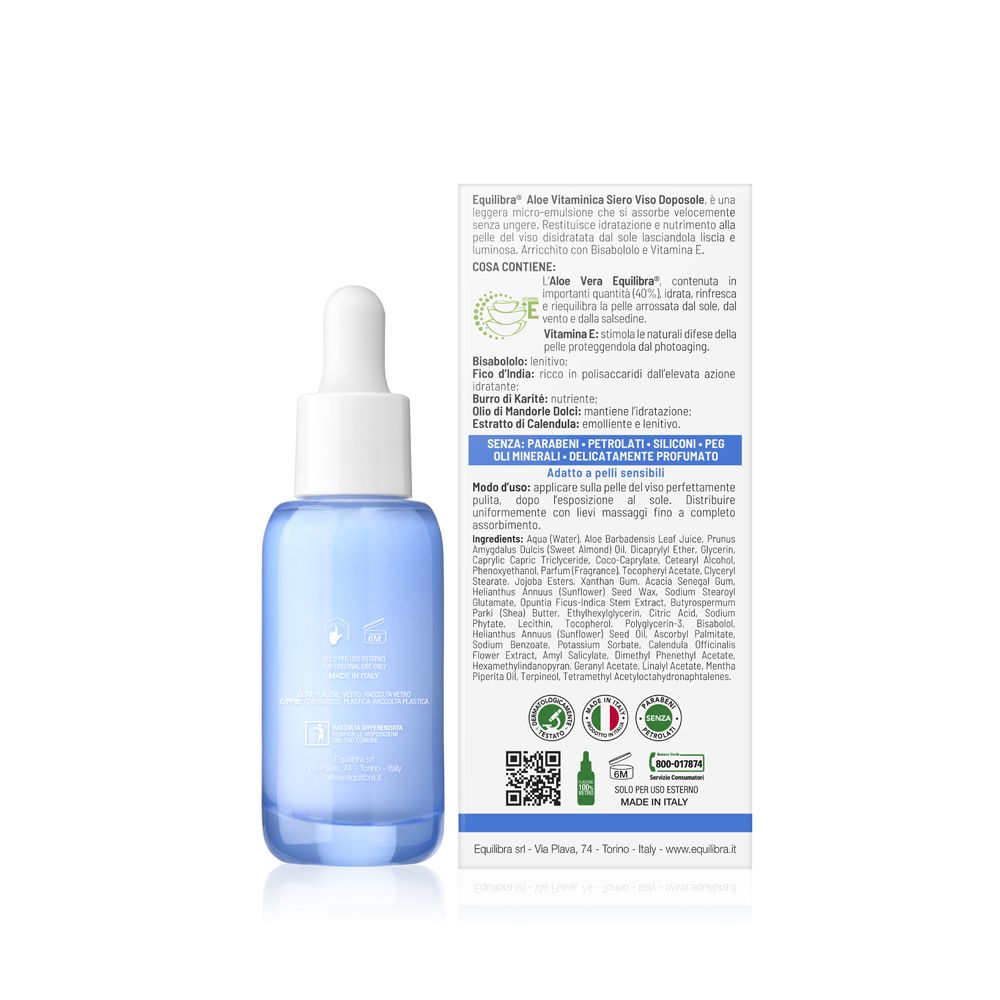 Equilibra Aloe Vitaminica Siero Viso Doposole Siero viso doposole in micro-emulsione leggera, si assorbe rapidamente senza ungere. Idrata e nutre la pelle del viso disidratata dal sole, lasciandola liscia e luminosa. Con il 40% di aloe vera Equilibra, bisabololo e vitamina E, rinfresca e riequilibra la pelle arrossata da sole, vento e salsedine, contribuendo a proteggerla dal photoaging. Modo d'uso: Applicare sulla pelle del viso perfettamente pulita, dopo l’esposizione al sole. Distribuire uniformemente con lievi massaggi fino a completo assorbimento. Ingredienti: Aqua (Water), Aloe Barbadensis Leaf Juice, Prunus Amygdalus Dulcis (Sweet Almond) Oil, Dicaprylyl Ether, Glycerin, Caprylic Capric Triclyceride, Coco-Caprylate, Cetearyl Alcohol, Phenoxyethanol, Parfum (Fragrance), Tocopheryl Acetate, Clyceryl Stearate, Jojoba Esters, Xanthan Gum, Acacia Senegal Gum, Helianthus Annuus (Sunower) Seed Wax, Sodium Stearoyl Glutamate, Opuntia Ficus-Indica Stem Extract, Butyrospermum Parkii (Shea) Butter, Ethylhexylglycerin, Citric Acid, Sodium Phytate, Lecithin, Tocopherol, Polyglycerin-3, Bisabolol, Helianthus Annuus (Sunflower) Seed Oil, Ascorbyl Palmitate, Sodium Benzoate, Potassium Sorbate, Calendula Officinalis Flower Extract, Amyl Salicylate, Dimethyl Phenethyl Acetate, Hexamethylindanopyran, Geranyl Acetate, Linalyl Acetate, Mentha Piperita Oil, Terpineol, Tetramethyl Acetyloctahydronaphtalenes. Avvertenze: Uso esterno.
