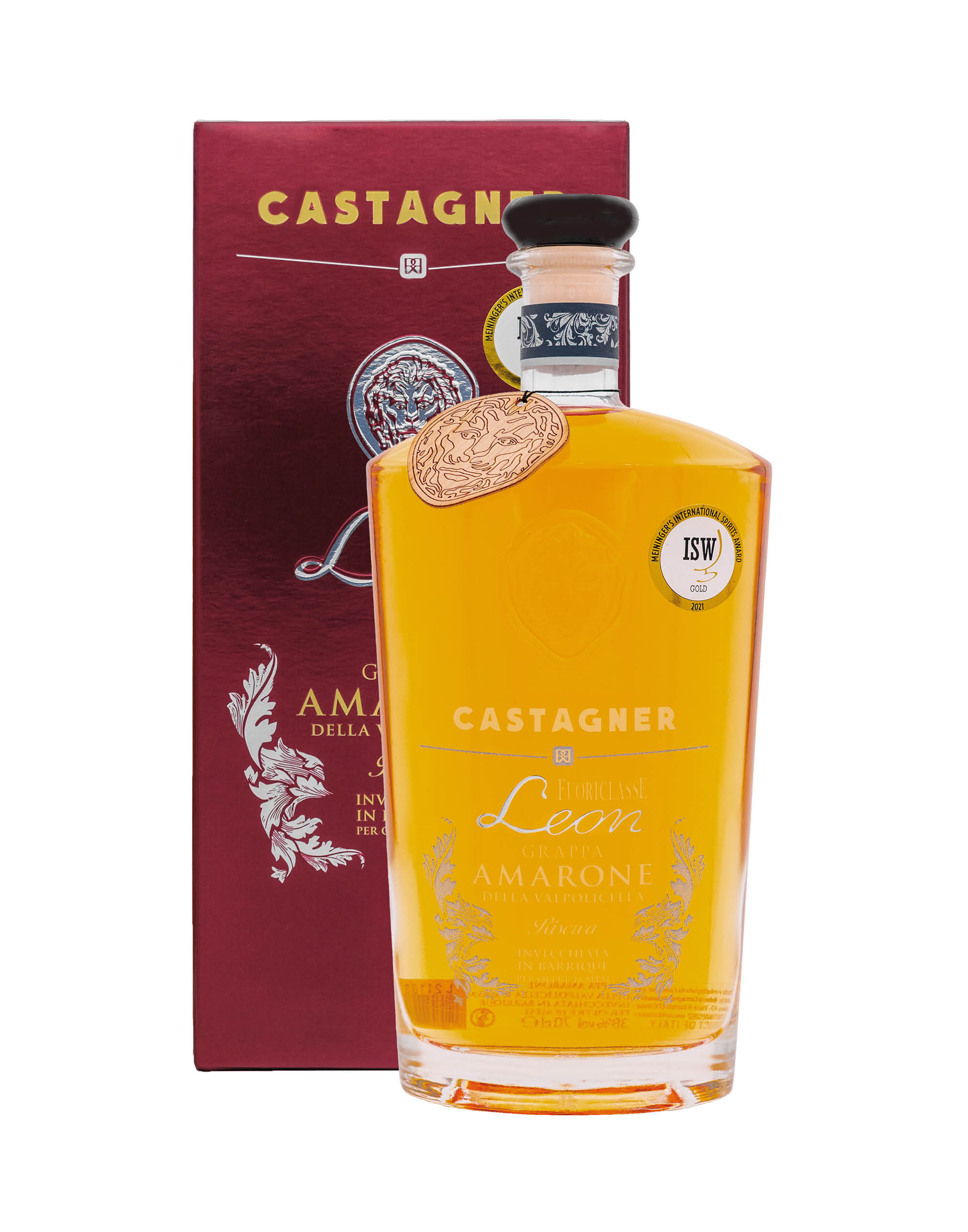 La grappa Fuoriclasse Leon Amarone Riserva di Castagner nasce da vinacce di uve della Valpolicella, lasciate ad appassire per oltre 100 giorni prima di essere vinificate.Le vinacce sono trattate e conservate con Grappasystem, un sistema grazie al quale è possibile procedere con una fermentazione controllata, ottenuta con l’aggiunta di lieviti enologici selezionati. Grappasystem garantisce una conservazione delle bucce in un ambiente ideale e con il giusto livello di pH, dentro a tunnel di film plastico alimentare, ad alta pressione e in assenza di ossigeno. Questo è il segreto che permette alle bucce d’uva di conservarsi freschissime e mantenere intatti gli aromi anche per diversi mesi.La distillazione avviene in parte in alambicchi tradizionali a bagnomaria e in parte in impianti tecnologicamente avanzati a colonna, in tre distillazioni diverse. Prima dell'invecchiamento la grappa viene fatta riposare per almeno 18 mesi in piccole barrique di rovere di primo e secondo passaggio, utilizzate precedentemente per l'affinamento dell'Amarone.Al naso si avvertono profumi intensi di vaniglia, miele, uva passa, pesca e mandorla amara. Al palato è rotonda, morbida e persistente.Ottima a fine pasto, si serve a temperatura ambiente liscia o in accompagnamento a cioccolato fondente e dolci alla crema.