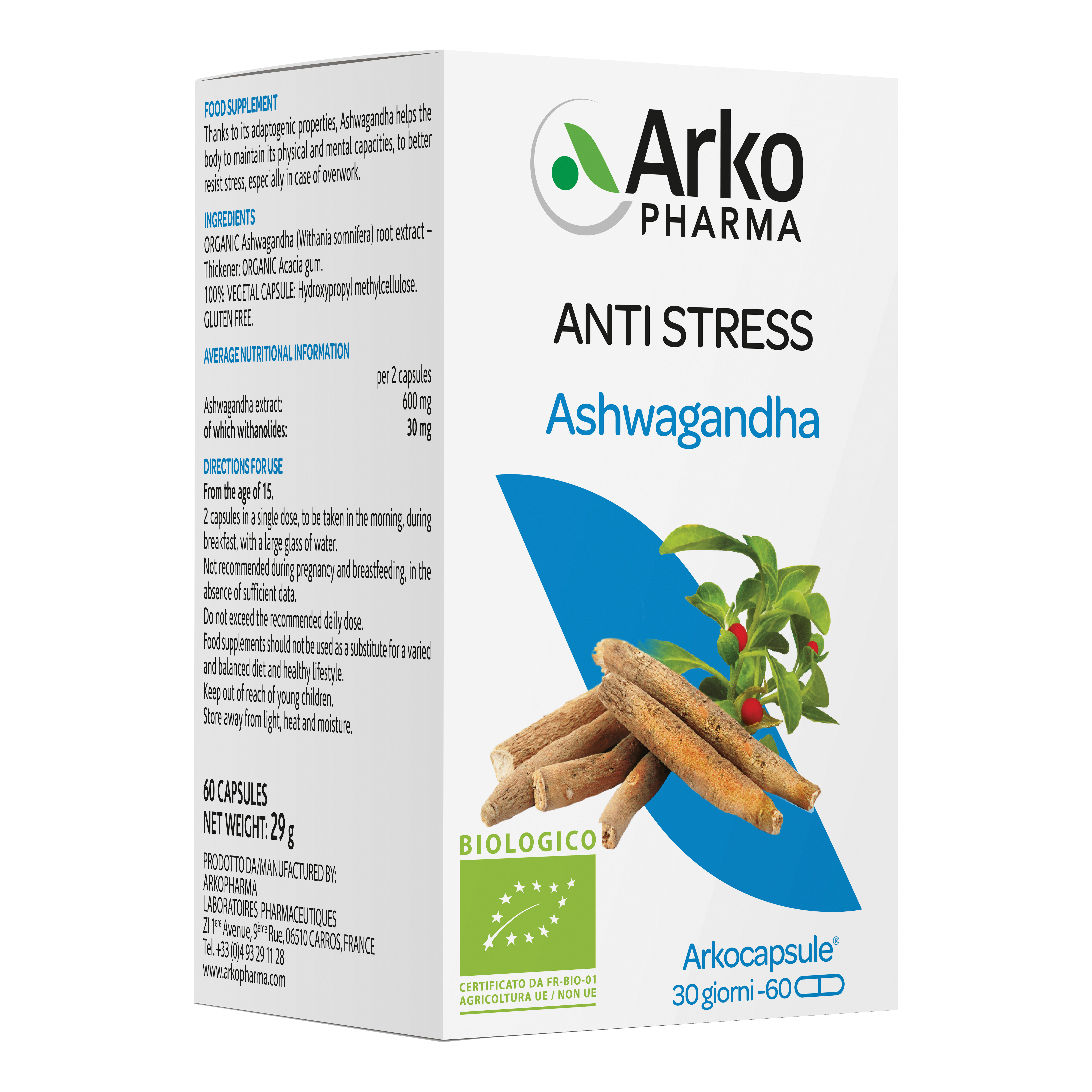 Arko PHARMA ANTI STRESS Ashwagandha Descrizione Integratore alimentare. Grazie alle sue proprietà adattogene, ashwagandha aiuta il corpo a mantenere le capacità fisiche e mentali per resistere meglio allo stress, specialmente in caso di periodi di lavoro intensi. Ingredienti Estratto di radice di ashwaganda BIO (Withania somnifera); addensante: gomma di acacia BIO. Capsula 100% vegetale: idrossipropilmetilcellulosa. Senza glutine . Caratteristiche nutrizionali Valori medi per 2 capsule Estratto di ashwagandha di cui withanolidi 600 mg 30 mg Modalità d'uso A partire dai 15 anni. 2 capsule in 1 sola assunzione, al mattino durante la colazione, con un abbondante bicchiere d’acqua. Avvertenze Non consigliato in gravidanza o allattamento in assenza di dati sufficienti. Non superare le dosi giornaliere consigliate. Un integratore alimentare non può sostituirsi ad una dieta variata ed equilibrata e ad uno stile di vita sano. Tenere fuori dalla portata dei bambini al di sotto dei tre anni. Conservazione Conservare al riparo dalla luce, dal calore e dall’umidità . Formato Confezione da 60 capsule. Peso netto: 29 g. Cod. 91010574