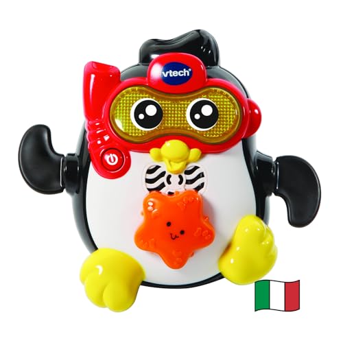 GUARDALO NUOTARE: il bambino, ruotando la stella marina, fa muovere le ali del pinguino che inizierà a nuotare dentro alla vasca DIVERTENTE: il pinguino canta e mentre nuota all'interno della vasca insieme al bambino ATTIVALO CON UN PULSANTE: il pulsante che è presente sulla maschera luminosa del pinguino attiva frasi, canzoni e melodie PIENO DI SUONI: il formato giocoso e colorato di questo giocattolo accompagna il bambino nelle sue scoperte insieme a 10 melodie e 2 canzoni SICURO: questo gioco bagnetto per bambini è dotato di spegnimento automatico per renderlo sicuro all'utilizzo