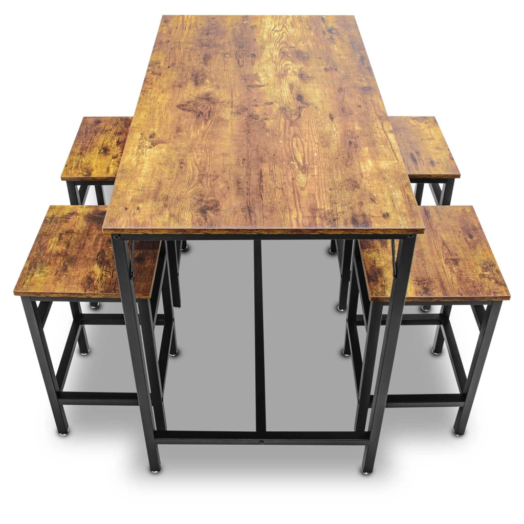 Sabi è un tavolino alto con 4 sgabelli quadrati in stile industriale. E' perfetto sia in cucina che in salotto come bancone bar o angolo breakfast; ancora, può rivelarsi una pratica superficie d'appoggio per una postazione di lavoro saltuaria. Grazie alle dimensioni compatte di tavolo (100x60xH88) e sgabelli (32x32xH57), l'intero set da pranzo occupa poco spazio e le sedute possono essere agevolmente riposte sotto il tavolo per risparmiare spazio. Sia il tavolino che gli sgabelli sono dotati di pratici poggiapiedi che consentono di stare seduti in maniera comoda anche a lungo e non solo per un pasto veloce. La robusta struttura è in metallo e i ripiani (spessi 1,5 cm) in legno MDF, un materiale leggero ma durevole. I piedini autolivellanti ed antiribaltamento (inclusi) forniscono massima stabilità e consentono un montaggio ottimale per un utilizzo più sicuro. Frankystar presenta una nuova linea di mobili in stile industriale. Arreda la tua casa con stile ed eleganza scegliendo diversi pezzi d'arredo della stessa collezione. Il prodotto arriva da montare, corredato di pratico manuale d'uso. Brand:FrankystarColore:MarroneTipo di Prodotto:Set da PranzoStile:IndustrialeMateriale:MDFFinitura:OpacaMateriale telaio:MetalloPieghevole:NoDimensioni delle sedute (cm):32x32x57 (LxPxH)Dimensioni del tavolino (cm):100x60x88 (LxPxH)Dotato di cuscino:NoCapienza :4 postiRichiede assemblaggio:Sì
