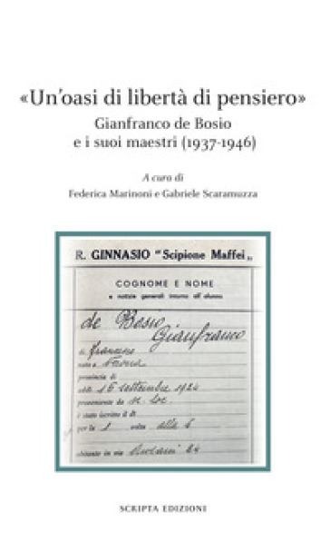 Il centenario della nascita di Gianfranco de Bosio ha preso avvio con due Giornate di studi intitolate «Un'oasi di libertà di pensiero». Gianfranco de Bosio e i suoi maestri (1937-1946). I lavori si sono svolti - il 18 e il 19 aprile 2024 - presso il Liceo classico "Scipione Maffei" di Verona, il prestigioso istituto dove lo stesso de Bosio diede avvio alla sua formazione umanistica, sotto la guida - tra gli altri - dell'amatissimo e mai dimenticato professore di Filosofia, e futuro docente di Estetica, Dino Formaggio. Agli interventi di Gabriele Scaramuzza, di Fabrizio Pompei e di Federica Marinoni è seguita la proiezione del film Il terrorista (1963), opera prima per il cinema di Gianfranco de Bosio, recentemente restaurata dalla Société Cinématografique Lyre. Si raccolgono, oggi, i testi delle tre relazioni, con un'appendice di documenti inediti, custoditi in parte presso la Biblioteca di Filosofia dell'Università degli Studi Milano, in parte presso l'Archivio storico del Liceo "Maffei".