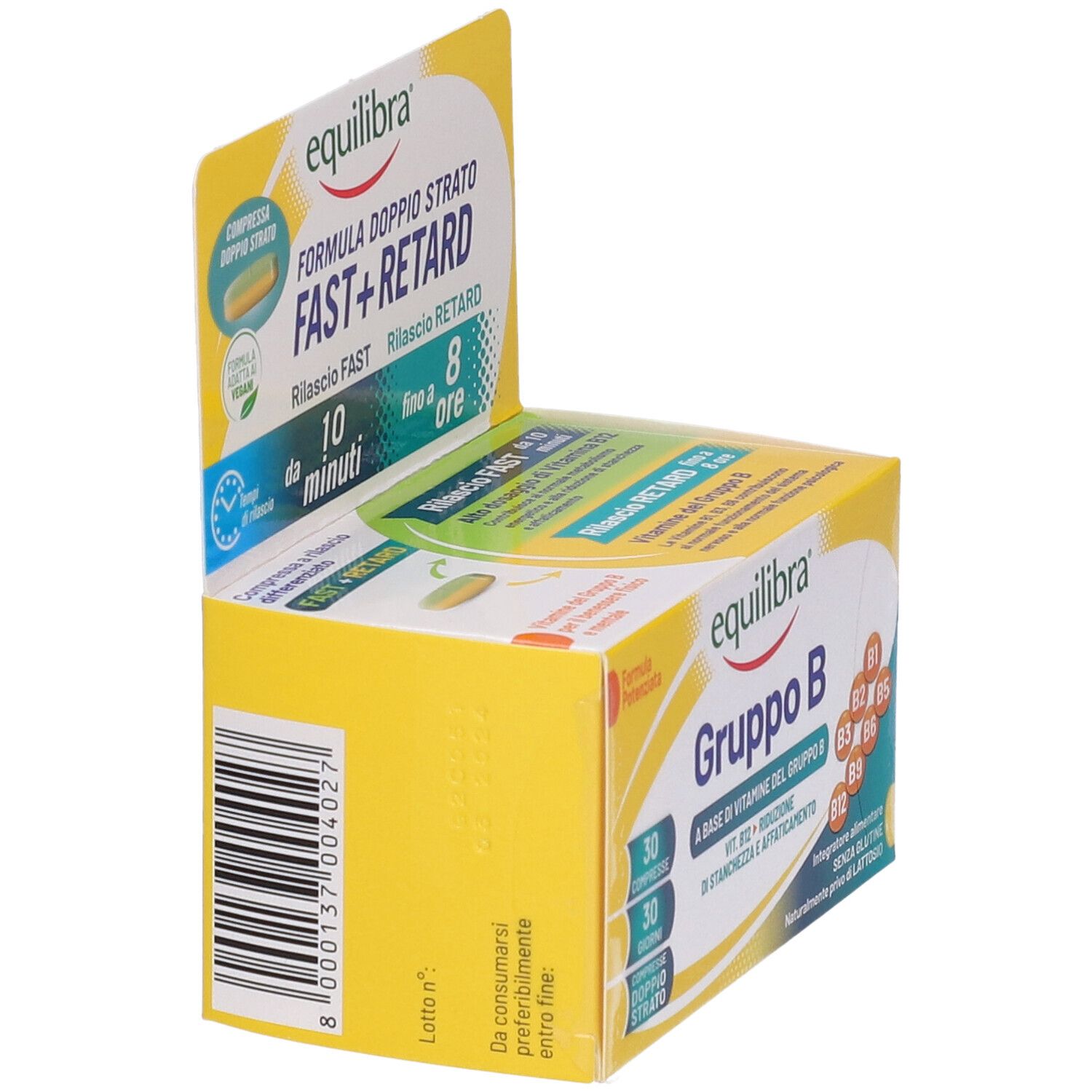 Gli integratori non sostituiscono un’alimentazione equilibrata e variegata e uno stile di vita sano. Gruppo B Equilibra® è un integratore alimentare a base di Vitamine del Gruppo B in compresse doppio strato formulate con tecnologia innovativa Fast+Retard che permette un rilascio graduale nel tempo delle vitamine: Strato Fast con un alto dosaggio di Vitamina B12. Strato Retard con Vitamine del gruppo B. Gruppo B Equilibra® è formulato per ridurre stanchezza e affaticamento grazie alla Vitamina B12, all’ Acido Folico (Vit. B9) e all’Acido Pantotenico (Vit. B5). Le Vitamine B1, B2, B3 e B6 contribuiscono al normale metabolismo energetico ed al normale funzionamento del sistema nervoso. La Vitamina B12 e l’Acido Folico (Vit. B9) supportano inoltre la normale funzione del sistema immunitario e la funzione psicologica. Ingredienti: Agenti di carica: cellulosa, fosfato dicalcico, idrossipropilmetilcellulosa, carbossimetilcellulosa sodica reticolata; Niacina (nicotinamide), Vitamina B1 (cloridrato di tiamina), Vitamina B2 (riboflavina), Acido pantotenico (D-pantotenato, calcio), agenti antiagglomeranti: sali di magnesio degli acidi grassi, biossido di silicio;spinacio in polvere (Spinacia oleracea L., foglie), Vitamina B6 (cloridrato di piridossina), colorante: ossidi di ferro e idrossidi di ferro; Vitamina B12 (cianocobalamina), Acido folico (acido pteroil-monoglutammico). Analisi media Per 1 compressa Vnr% Vitamina B12 500 mcg 20.000 Niacina (Vit. B3) 54 mg 338 Tiamina (Vit. B1) 25 mg 2.273 Riboflavina (Vit. B2) 25 mg 1.786 Acido pantotenico (Vit. B5) 18 mg 300 Vitamina B6 10 mg 714 Vitamina B12 500 mcg 20.000 Acido folico (Vit. B9) 400 mcg 200 Vitamina B12 totale 1.000 mcg 40.000 Vnr = Valori Nutritivi di Riferimento Assunzione consigliata: Si consiglia 1 compressa al giorno da deglutire con un abbondante bicchiere d’acqua preferibilmente al mattino. Per facilitare la deglutizione della compressa è possibile dividerla in 2 parti grazie al comodo pre-taglio. Avvertenze: Non superare la dose giornaliera raccomandata. Tenere fuori dalla portata dei bambini al di sotto dei tre anni. Conservazione: Conservare in un luogo fresco e asciutto, lontano dalla luce. Si prega di fare riferimento, se necessario, ad ulteriori istruzioni riportate sulla confezione. Contenuto: 30 compresse= 30g Produttore: Equilibra S.r.l. Via Plava 74 10135 Torino Italia