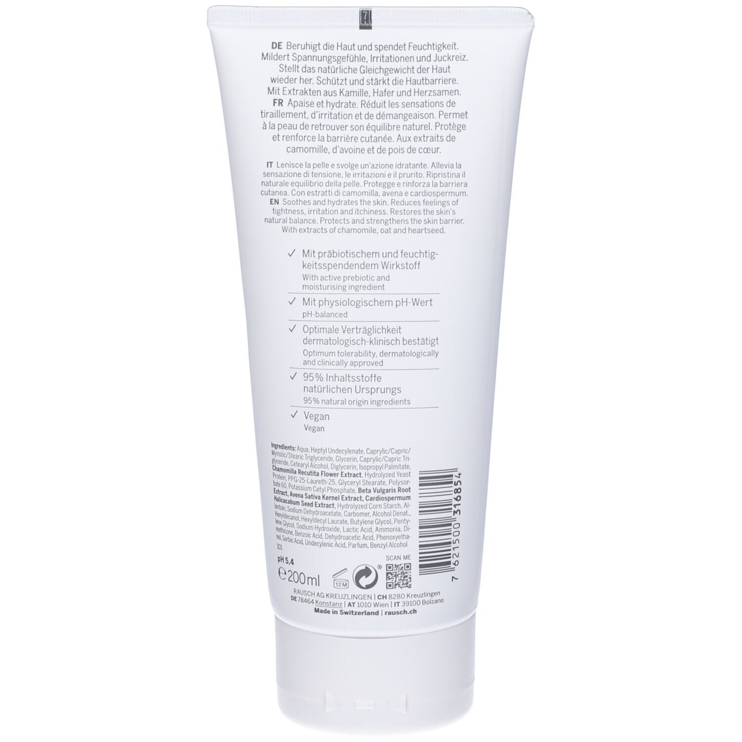 Rausch Delicata Body Lotion Alla Camomilla La Body Lotion alla Camomilla di Rausch è pensata per la pelle secca e sensibile, offrendo una cura intensiva e riequilibrante grazie a una formula migliorata e arricchita con un principio attivo prebiotico. Questa lozione aiuta a rinforzare la barriera cutanea, alleviare irritazioni, tensioni e prurito, restituendo comfort e idratazione alla pelle. Con il 95% di ingredienti di origine naturale, contiene estratti di camomilla, avena e cardiospermum. La fragranza floreale e agrumata aggiunge un tocco di freschezza. La formula vegana, priva di siliconi e con pH 5,4, è particolarmente delicata, dermatologicamente testata e prodotta in Svizzera. Modo d'uso: Dopo la doccia, applicare sulla cute asciutta e massaggiare delicatamente. Ingredienti: Aqua, Heptyl Undecylenate, Caprylic/Capric/Myristic/Stearic Triglyceride, Glycerin, Caprylic/Capric Triglyceride, Cetearyl Alcohol, Diglycerin, Isopropyl Palmitate, Chamomilla Recutita Flower Extract, Hydrolyzed Yeast Protein, PPG-25-Laureth-25, Glyceryl Stearate, Polysorbate 60, Potassium Cetyl Phosphate, Beta Vulgaris Root Extract, Avena Sativa Kernel Extract, Cardiospermum Halicacabum Seed Extract, Hydrolyzed Corn Starch, Allantoin, Sodium Dehydroacetate, Carbomer, Alcohol Denat., Hexyldecanol, Hexyldecyl Laurate, Butylene Glycol, Pentylene Glycol, Sodium Hydroxide, Lactic Acid, Ammonia, Dimethicone, Benzoic Acid, Dehydroacetic Acid, Phenoxyethanol, Sorbic Acid, Undecylenic Acid, Parfum, Benzyl Alcohol.