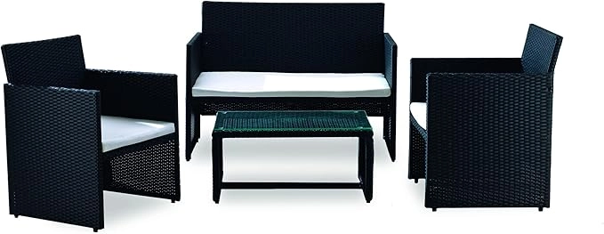 Salotto Valencia Black costituito da 2 poltrone 1 divano 1 tavolo rettangolare con top in vetro temperato spesso 5 mm - Colore Nero Cuscini Colore Bianco struttura in acciaio verniciato con vernici epossidiche, rivestimento in polyrattan Misure prodotto: Poltrona 59x65x75h cm; Divano 111x65x75h cm; Tavolo 84x45X37H cm