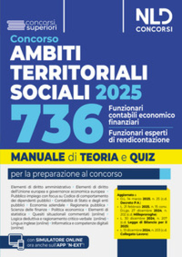 Il Manuale Concorso ATS. Ambiti Territoriali Sociali. 736 Funzionari contabili - economico finanziario/Funzionario esperto di rendicontazione. Teoria e Quiz. NLD Concorsi 2025 è stato realizzato per supportare chi intende iniziare la preparazione al concorso. Il Volume si caratterizza per una trattazione completa, aggiornata e, al contempo, schematica e fluida delle seguenti materie: Elementi di diritto amministrativo; Elementi di diritto dell'Unione europea e governance economica europea; Pubblico impiego e Codice di comportamento dei dipendenti pubblici; Contabilità di Stato e degli enti pubblici; Economia aziendale; Ragioneria pubblica; Scienza delle finanze; Politica economica; Elementi di statistica; Quesiti situazionali commentati (online); Logica deduttiva e ragionamento critico-verbale (online); Lingua inglese (online); Informatica e competenze digitali (online). Il Manuale ATS. Ambiti Territoriali Sociali. 736 Funzionari contabili. Teoria e Quiz è aggiornato alle più recenti novità legislative, tra cui il D.l. 14 marzo 2025, n. 25 (c.d. Decreto P.A.), la L. 30 dicembre 2024, n. 207 (c.d. Legge di Bilancio per il 2025), la L. 21 febbraio 2025, n.15 conv. D.lgs. 27 dicembre 2024, n.202 (c.d. Milleproroghe) e la L. 13 dicembre 2024, n.203 (c.d. Collegato Lavoro). Per consentire di affiancare allo studio teorico una immediata verifica della acquisita capacità di risolvere i corrispondenti test, il Manuale presenta quiz di verifica suddivisi per ciascuna Parte o per singoli Capitoli. Il Volume permette, infine, l'accesso ad un'estensione online consultabile con apposita password per rimanere sempre aggiornati sulle materie trattate e per accedere al simulatore online.