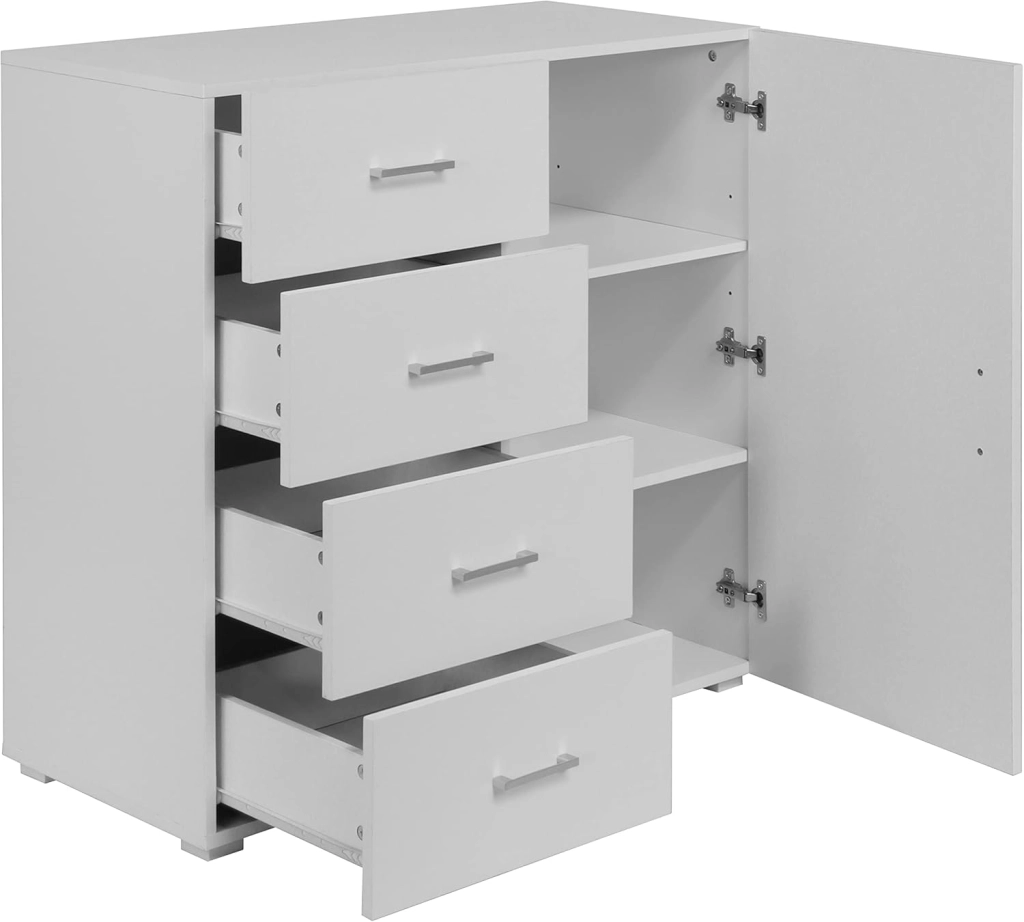Cassettiera bianca 4 cassetti c/anta Maniglie e piedini silver Prodotto da assemblare in MDF 15 mm ad uso interno 90x41x87 H cm