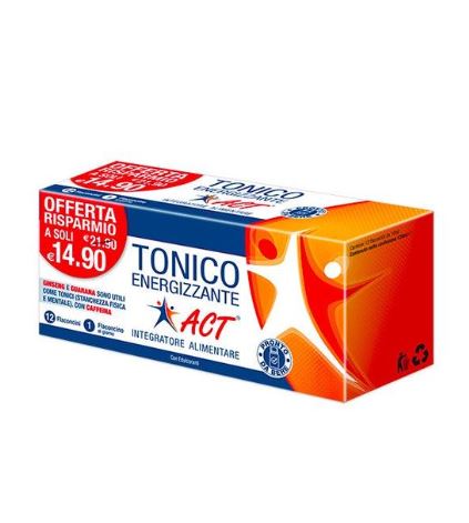 Tonico Energizzante Act 12 flaconcini da 10 ml - Integratore AlimentareAiuta il nostro organismo fornendo energia pronta da bere quando la stanchezza fisica e mentale si fanno sentire.Con Caffeina, Ginseng e Guaranà..Senza zucchero.Modalitàd'uso