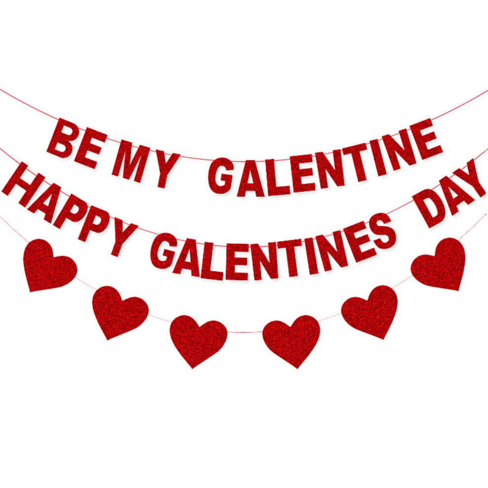Striscione rosso glitterato BE MY GALENTINE ""Happy Galentine's Day"" con ghirlanda a forma di cuore per amiche e ragazze.