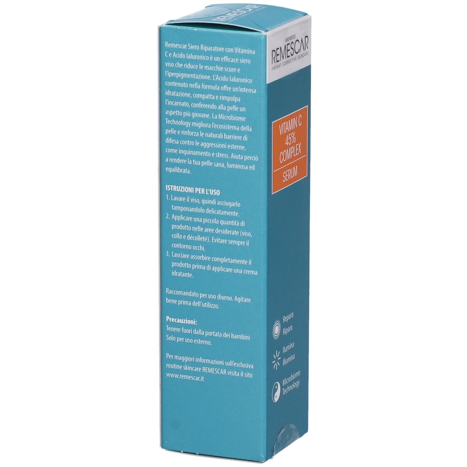Remescar Siero Vitamina C Viso Il siero riparatore Remescar a base di Vitamina C e acido ialuronico riduce la visibilità delle macchie scure e l'iperpigmentazione. Aiuta a proteggere dai raggi UV e contemporaneamente ripara la pelle danneggiata dal sole. Riducendo il rossore e lenendo la pelle ottiene l’obiettivo di donare una pelle più sana e un tono più uniforme. La produzione di collagene è stimolata per ottenere una pelle più soda e levigata. L'uso di un complesso potente e stabilizzato al 45% di vitamina C porta i massimi benefici e dei risultati profondi. Modo d'uso: Applicare il prodotto quotidianamente e lasciarlo assorbire. Ingredienti: Aqua, Glycerin, Caprylic/Capric Triglyceride, Dimethicone, Propanediol, Sodium Hyaluronate, Sodium Ascorbyl Phosphate, Glyceryl Stearate, Laminaria Digitata Extract, Chlorella Vulgaris Extract, Saccharide Isomerate, Sea Water, Xanthan Gum, Tetrasodium Glutamate Diacetate, Ethylhexylglycerin, Phenethyl Alcohol, Acrylates/C10-30 Alkyl Acrylate Crosspolymer, Peg-100 Stearate, Citric Acid, Sodium Hydroxide, Phenoxyethanol.