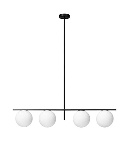 Sospensione a 4 luci in vetro soffiato bianco latte Diametro 20 cm Montatura verniciata nero Possibilità di utilizzare i tubi di cm 40 e cm 50