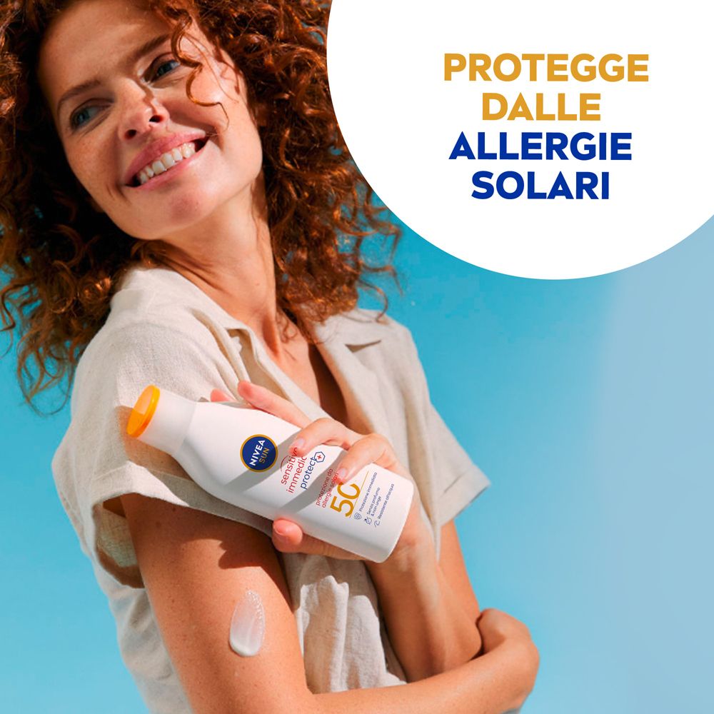 Nivea Sun Latte Solare Sensitive Immediate Protect Fp30 200 ml, Crema solare per pelli sensibili Nivea Sun Crema Solare Sensitive Immediate Protect Fp30 – La protezione ideale per le pelli sensibili Nivea Sun Crema Solare Sensitive Immediate Protect Fp30 protegge immediatamente le pelli sensibili dai raggi Uva e Uvb e previene le irritazioni causate dall'esposizione al sole. La sua formula con Aloe Vera e Olio di Jojoba è particolarmente delicata, non contiene profumo ed è resistente all'acqua. La sua texture è leggera, non grassa e si assorbe rapidamente. La crema solare corpo Nivea Sun rispetta la barriera corallina poiché priva di filtri UV contenenti Octinoxate, Oxybenzone e Octocrylene e microplastiche. La formula è biodegradabile al 77% e il flacone in plastica riciclata al 50% (senza tappo ed etichetta). Vantaggi del prodotto: Crema solare corpo Con Fp30 (Protezione Alta) Con Aloe Vera e Olio di Jojoba Formula lenitiva Senza profumo Resistente all'acqua Priva di filtri UV nocivi Modo d´uso: Applicare abbondantemente prima dell'esposizione al sole e riapplicare frequentemente, specialmente dopo i bagni, aver sudato e l'uso dell'asciugamano, per mantenere il livello di protezione originario. Ingredienti: Aqua, Alcohol Denat., Isopropyl Palmitate, Ethylhexyl Salicylate, Bis-Ethylhexyloxyphenol Methoxyphenyl Triazine, Butyl Methoxydibenzoylmethane, Dibutyl Adipate, Butylene Glycol Dicaprylate/Dicaprate, Ethylhexyl Triazone, Glyceryl Stearate, Glycerin, Phenylbenzimidazole Sulfonic Acid, Simmondsia Chinensis Seed Oil, Aloe Barbadensis Leaf Juice Powder, Tocopheryl Acetate, Hydroxypropyl Starch Phosphate, Microcrystalline Cellulose, Copernicia Cerifera Cera, Hydrogenated Rapeseed Oil, Silica Dimethyl Silylate, Cetyl Palmitate, Xanthan Gum, Hydroxyacetophenone, Sodium Stearoyl Glutamate, Ethylhexylglycerin, Trisodium Edta, Cellulose Gum, Caprylyl Glycol, Sodium Hydroxide, Sodium Chloride.