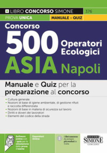 Il "Manuale Concorso ASIA Napoli 2022 - 500 Operatori ecologici" è indirizzato alla preparazione alla prova scritta unica prevista dal bando di selezione pubblicato dall'agenzia ASIA Napoli in data 27 giugno per l'assunzione di 500 operatori ecologici da destinare alle attività di spazzamento e raccolta differenziata nella Città di Napoli. Il bando, aperto a tutti i candidati in possesso del titolo licenza media e con patente di tipo A e/o B, prevede una prova scritta che consiste nella risoluzione di 50 quesiti a risposta multipla in 50 minuti. In aderenza al bando, il libro è così strutturato: Parte I: Diritti e doveri dei lavoratori (Elementi di diritto del lavoro: in particolare dei doveri del dipendente e sul mancato rispetto dei predetti); Parte II: Nozioni di base in materia di sicurezza sul lavoro (Principi di sicurezza sul lavoro, D. Lgs. 81/08 e s.m.i.); Parte III: Nozioni di base di igiene ambientale, di gestione rifiuti e raccolta differenziata (Nozioni generali sulla gestione dei rifiuti, D. Lgs.152/2006 e s.m.i.); Parte IV: Elementi di Codice della strada (D. Lgs.285/1992 e ss.mm.ii. - L.120/2010 e ss.mm.ii.); Parte V: Cultura generale - Questionario commentato; Parte VI: Questionari. Completano il manuale Concorso ASIA Napoli 2022 numerose espansioni online e un software con migliaia di quiz per esercitarsi con infinite simulazioni in vista della prova d'esame.