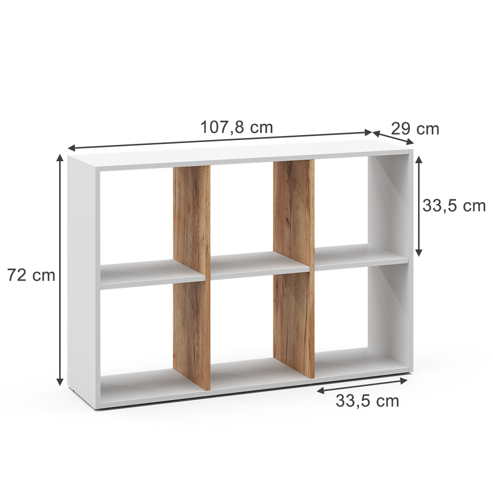 Con il nostro divisorio quadrato, puoi creare un'atmosfera funzionale ed elegante nella tua casa in pochissimo tempo. Questo divisorio aperto offre ampio spazio per libri, decorazioni o persino scatole 30x30 cm. I sei ripiani aperti non solo sono pratici, ma creano anche un vero e proprio elemento di spicco nella tua stanza grazie all'ingegnoso design a cubo. Il nostro divisorio può essere utilizzato come libreria o come mensola, adattandosi perfettamente a qualsiasi situazione abitativa. Il quadrato offre numerose altre varianti per adattare il divisorio alle tue esigenze. Lasciati ispirare dal nostro divisorio e crea la casa perfetta per te! --- Dettagli tecnici: Colori: Rovere bianco/Goldkraft Massa: 72 x 107,8 x 29 cm (LxAxP) Materiale: Truciolare, 16 mm Superficie: Rivestimento in resina melamminica Peso dell'articolo: 19,1 kg Peso dell'articolo, imballaggio incluso: 21 chili --- CONTENUTO DELLA CONFEZIONE: Mensola autoportante, istruzioni di montaggio e accessori per il montaggio. (Decorazioni non incluse)